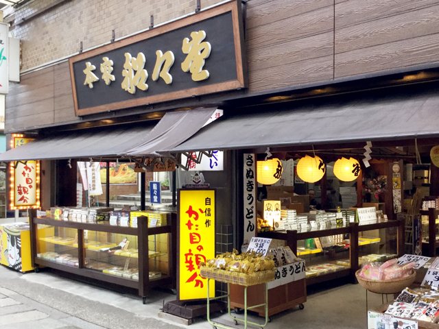 金毘羅さんのお参りにむかう参道にあるお店です。店頭でおせんべいを焼いていて、いい香りが漂っています。一枚50円でばら売りもしてくれるので、食べながらお参りにむかうのも楽しいです。焼きたてのおせんべいはちょっとしんなりとしていて、食べているうちにパリッとしてきて食感が変わるのも面白いです。