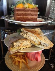 3段のショコラショコラランチを食べました。本日のサンドはフィッシュフライサンドで、ごまトーストと熱々サクサクのフィッシュフライと、マスタードの効いたマヨネーズのバランスがよくておいしかったです。あと、具だくさんのクラムチャウダーとポテトフライとポテトサラダ、一番上には大きなチョコレートケーキが!その上、コーヒーはポットで2杯以上あり、ボリューム満点でお腹いっぱいになりました。人気な理由が分かりました。ケーキが何かは来てのお楽しみでした。