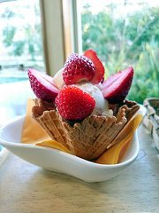ワッフルdeジェラートを食べました。 ジェラートは3種類選べます♪ メープルウォールナッツ、ストロベリーミルフィーユ、バニラを選びました。 ワッフルコーンの中に小ぶりのジェラートが3種類と大きな苺「さちのか」贅沢なパフェなのに安いです! この日食べたメープルナッツがすごく美味しくて気に入りました♡