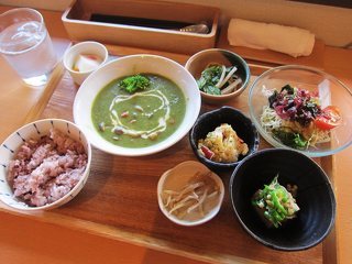 日替わりランチ980円を注文しました。この日のメインは豆乳で作ったほれんそうスープ。豆やきのこなど具だくさんで緑色が綺麗♪他にはおくらとジャコの薬膳奴っこ、春菊と大根の秋マリネなど野菜中心の小皿が色々付いて美味しくて楽しいです。 (投稿:2015/12/10 掲載:2015/12/11)