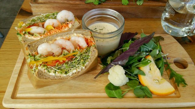 店内の席からは海が見えて開放感がある店内です。ランチに行ったのでちょっと早めに入ってランチの時間待ちをしていたのですがすぐに混んできていたので早めに行くのがおススメです。 シュリンプサンドを食べたのですがサンドイッチの中にはめちゃくちゃ野菜がたくさん入っていました。一口ではなかなかかぶりつけないくらいのボリュームです。サンドイッチの横についている野菜も見たことのない野菜があってどれも美味しかったですし、スープもついていてお腹一杯になりました。大満足です。 (投稿:2016/10/22 掲載:2016/10/27)