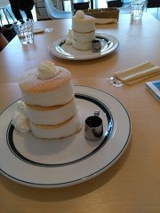 念願のプレミアムパンケーキをいただきました。前回は売り切れだったので 6人で二つを頼み一枚ずつ分けて食べましたが一人で三段重ねでも行けるぐらい思いのほかあっさりしていました。そしてもっと べちゃっとなるのかと思ったらとてもふわふわしっとりしっかりしていたのは驚きです。わざわざ大阪に食べに行った方もここのが美味しいって。 写真には写っていませんがホットの 紅茶は ポットに入って出てくるので2杯分ありました。 (投稿:2016/08/06 掲載:2016/08/10)