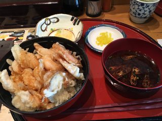 ランチタイムにえび天丼(800円)を注文しました。小ぶりのえび天10匹と季節の野菜が3種類入っていました。赤だしと小鉢とたくあん付き。丼はボリュームもあり、下のご飯に甘辛いタレが染みていてご飯だけでも美味しかったです。また行きます。 (投稿:2016/06/04 掲載:2016/06/23)