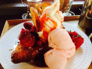いちごのクロワッサンジェラートとブレンドコーヒーを頂きました^^凄く豪華なトッピング!いちごアイスとソフトクリーム、イチゴジャム、数種類のベリー、、これだけでも幸せ気分ですね♪サクサクのクロワッサンとアイス、合います!最後の方はアイスが溶けてクロワッサンがしっとりとなりますが、それもまた違った食感となり、美味〜♪お腹いっぱいになるオススメのデザートです(・v・) (投稿:2016/04/02 掲載:2016/04/04)