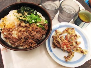 外のテラス席は屋根が付いてるので夏でも涼しいです。肉ぶっかけ 550円(大2玉)と、名物の注文を受けてから揚げるたこ天 220円をいただきました。角がたってモチモチ麺。衣に味付けされていて何もつけなくても美味しいです。場所は住宅街の中なので初めての方は迷うかも?駐車場は広いですよ。 (投稿:2015/12/13 掲載:2015/12/24)