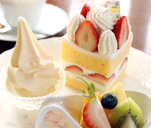 こちらで人気の「ケーキパレット」は、お好みのケーキに自家製ソフトクリーム、季節のフルーツ盛り合わせがひとつのプレートに並んだゴージャスなデザート。今回選んだ「スペシャルいちごショートケーキ」は、ザ・ショートケーキといった堂々たる風格。フォークを入れて形がくずれるのが惜しい美しさです。ずっしりとキメの細かいスポンジと濃厚な純生クリームにうっとり。ソフトクリームはリッチなコクがありながら、食べた後にしつこさの残らないすっきりとした甘さに仕上げられています。